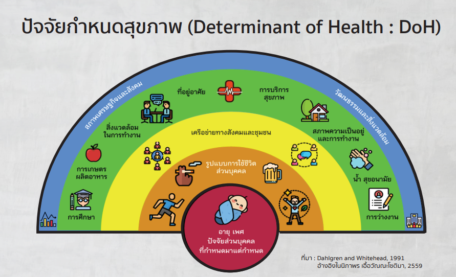 • รายได้และความมั่นคงทางการเงิน: คนที่มีรายได้น้อยมักมีโอกาสเข้าถึงอาหารที่มีคุณภาพ ที่อยู่อาศัยที่ปลอดภัย และบริการดูแลสุขภาพได้น้อยกว่า